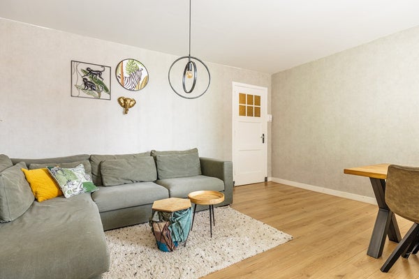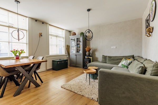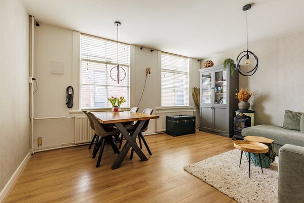 De woonkamer is royaal en prettig licht dankzij de grote raampartijen. De wanden zijn strak gestuct en de vloer is afgewerkt met laminaat, wat zorgt voor een verzorgde en moderne uitstraling binnen het karaktervolle pand. Hier is volop ruimte voor een comfortabele zithoek én een eettafel.