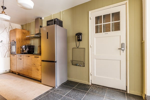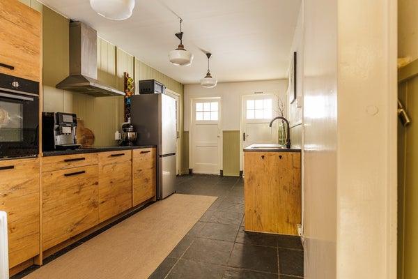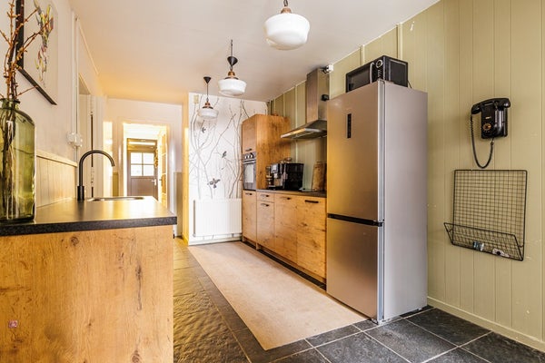 De keuken is apart gesitueerd en eveneens voorzien van een natuurstenen vloer. De keuken beschikt over diverse inbouwapparatuur en voldoende werk- en kastruimte. Vanuit de keuken is er toegang richting de tuin, wat het dagelijks gebruik extra prettig maakt.