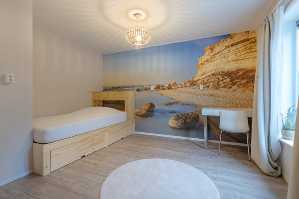 De slaapkamer is ruim van formaat en biedt voldoende plek voor een tweepersoonsbed en een kastenwand. Door de rechte wanden is deze kamer efficiënt in te delen.