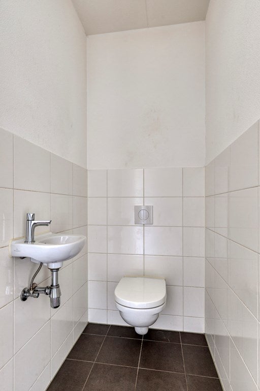 Centraal in de woning, grenzend aan de hal, vind je de badkamer. Deze volledig betegelde ruimte is voorzien van een ruime inloopdouche, wastafel met spiegel en opbergmeubel. De separate toiletruimte is eveneens betegeld en beschikt over een zwevend toilet met wastafel.