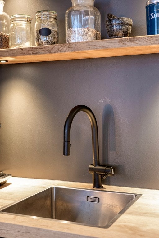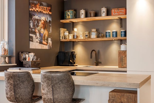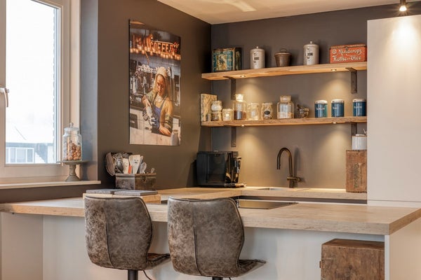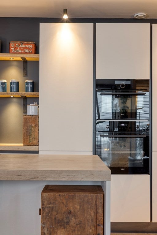 Als laatste komen we in de woonkamer/keuken terecht met nieuw gestucte plafonds. Een luxe ook in 2022 nieuw geplaatste keuken is voorzien van veel inbouwapparatuur zoals een inductiekookplaat met afzuigsysteem, een combi heteluchtoven met magnetron en een aparte heteluchtoven. Daarnaast zijn er een koelkast, een no-frostdiepvriezer en een XXL-vaatwasser ingebouwd.