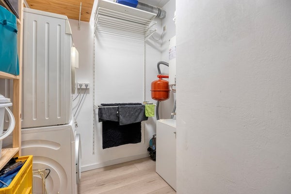 Weer de hal loopt u verder en treft u aan de linkerzijde een forse bergruimte aan waar de cv ketel met een draadloze klokthermostaat en mechanische ventilatie gesitueerd is. Tevens is er voldoende ruimte voor de wasmachine en droger. U kunt hier nog veel meer zaken kwijt zoals bijvoorbeeld een voorraadkast. Aan deze zijde in de hal is er ook een toiletruimte met wastafel. Aan de rechterzijde vindt u de derde slaapkamer.
