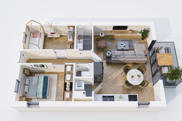 - De galerijflat heeft een woonoppervlakte van 52 m² en beschikt over 3 kamers, waarvan 2 slaapkamers;