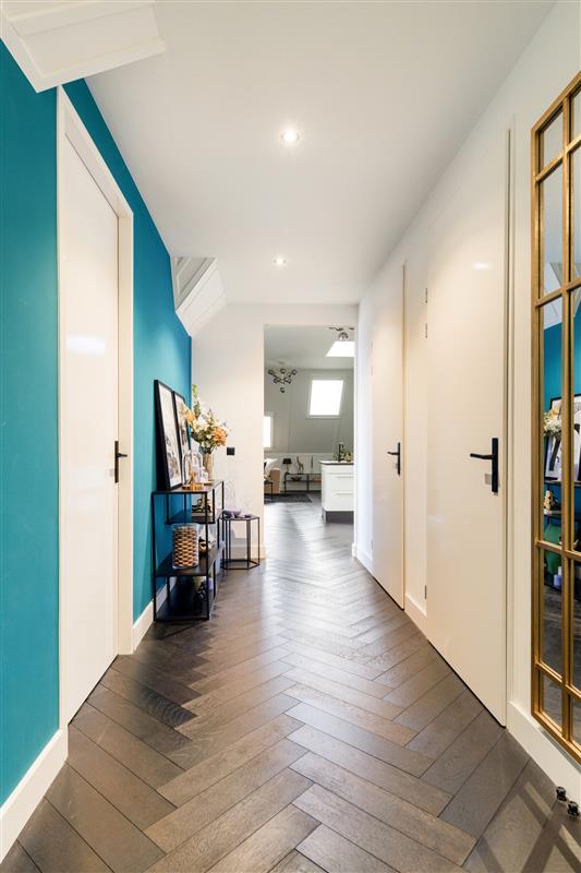 Via de centrale entree neem je de trap naar de tweede verdieping. Je komt binnen in de royale hal welke toegang geeft tot alle vertrekken. De sfeervolle woonkamer is licht en prettig ingedeeld en geeft toegang tot het op het zuiden gelegen balkon. De moderne open keuken is voorzien van alle benodigde inbouwapparatuur.