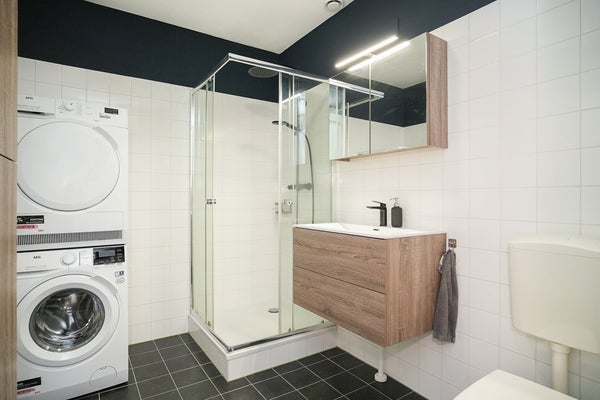 Centraal in het appartement ligt de badkamer, uitgerust met een douchecabine, wastafel, toilet en kasten. Ook zijn wasmachine en droger hier opgesteld.