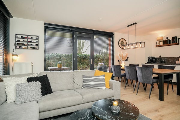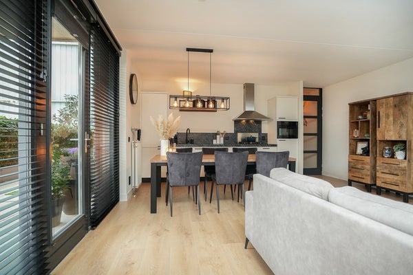 De woonkamer is met circa 34 m² prettig ruim en valt direct op door de grote raampartijen, die zorgen voor een fijne lichtinval.