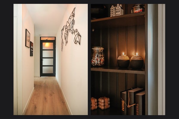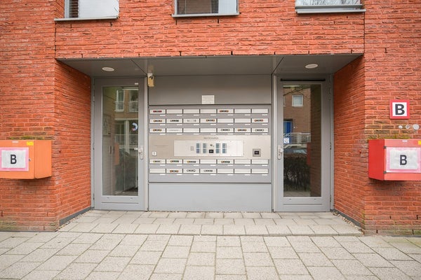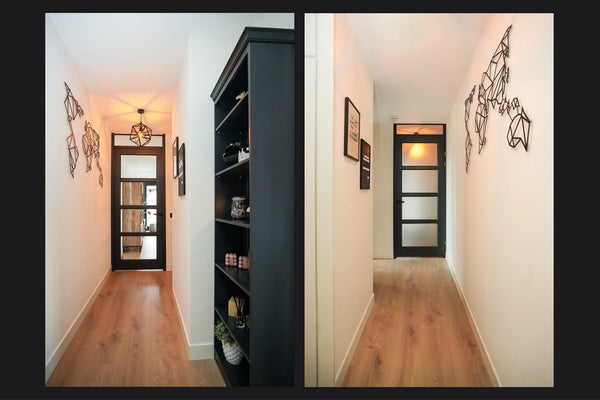 De entree bevindt zich aan de achterzijde van het appartementencomplex. Je komt binnen in een hal die toegang geeft tot de meterkast en garderobe. Via een deur met glazen panelen loop je door naar het 2e deel, waar de slaapkamer, de badkamer en woonkamer bereikbaar zijn.