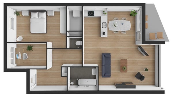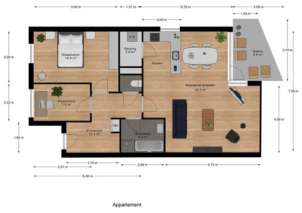- De galerijflat heeft een woonoppervlakte van 90 m² en beschikt over 3 kamers, waarvan 2 slaapkamers;