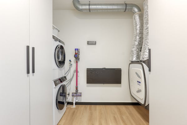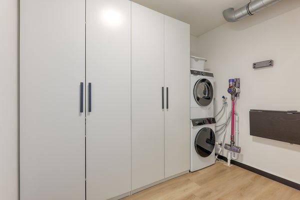 The apartment includes an internal storage room with connections for washing machine and dryer. There is also a private storage room in the basement and a communal bicycle storage with two fixed spots. If desired, you can rent a parking space in the secured underground garage, where electric charging is also available.