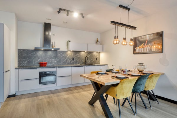 The modern open kitchen is fully equipped with built-in appliances: an induction hob with extractor, combi microwave/oven, dishwasher, fridge with freezer and a 5-in-1 Quooker tap with sparkling water function.