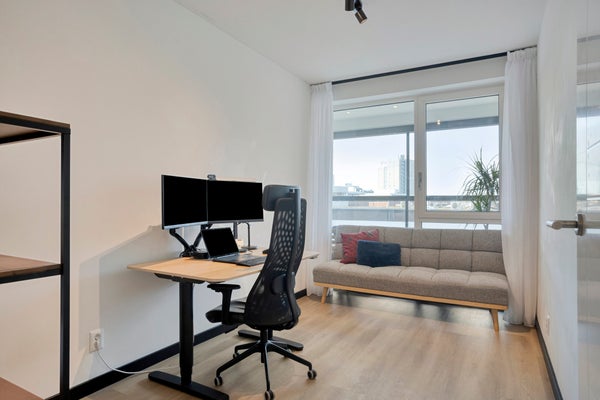 From the living room, you access the loggia - currently used as an office - which also works perfectly as a hobby or work space. But when you slide open the large window, the loggia transforms into a cosy outdoor area, ideal for morning coffee or an evening drink while watching the sunset.