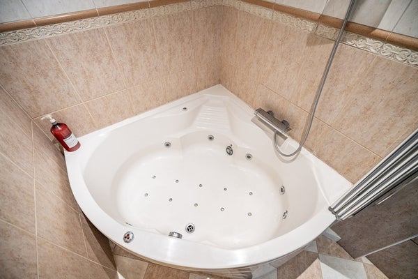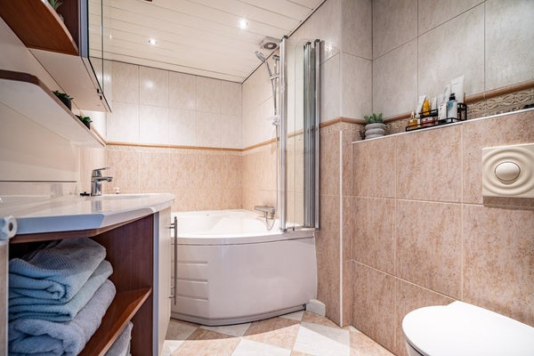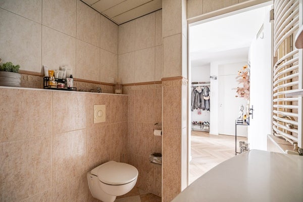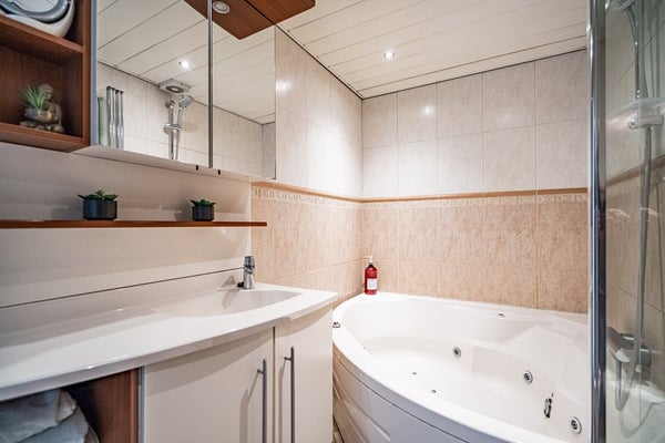 De volledig betegelde badkamer is luxe uitgevoerd en beschikt over een ligbad met whirlpoolfunctie, hangend toilet, wastafelmeubel, radiator en sfeervolle spotverlichting.