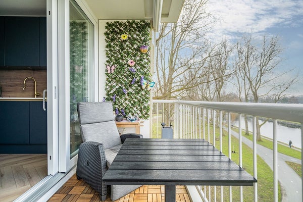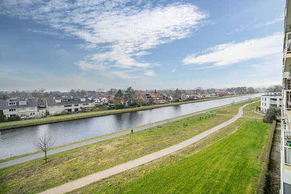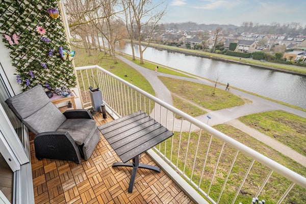 Het ruime balkon met zonnescherm op het zuidwesten is een absolute meerwaarde. Hier geniet u volop van de zon, rust en een prachtig uitzicht over de Korte Vliet en richting Voorschoten. De ideale plek om na een lange werkdag te ontspannen en de zon te zien ondergaan.