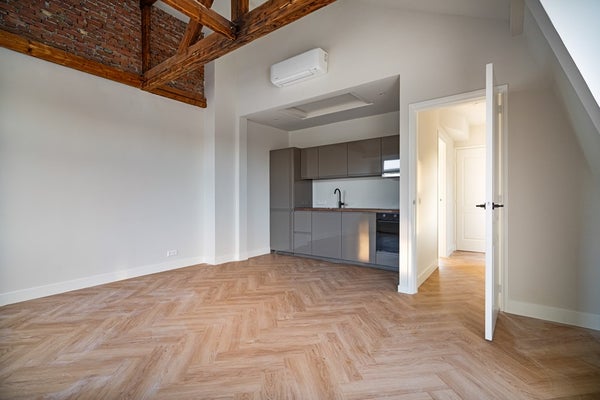 Bij binnenkomst valt direct het hoge afwerkingsniveau op. De lichte woonkamer beschikt over een luxe open keuken, uitgevoerd in moderne stijl en voorzien van hoogwaardige inbouwapparatuur. De combinatie van de strakke afwerking, luxe pvc-vloer en de prachtige originele balken geeft de ruimte een warm en karaktervol gevoel. Het appartement is volledig gestuct en gesaust en dankzij de dubbele beglazing, vloerisolatie, warmtepompboiler en airconditioning (koelen én verwarmen) is het wooncomfort van hoog niveau en klaar voor de toekomst.