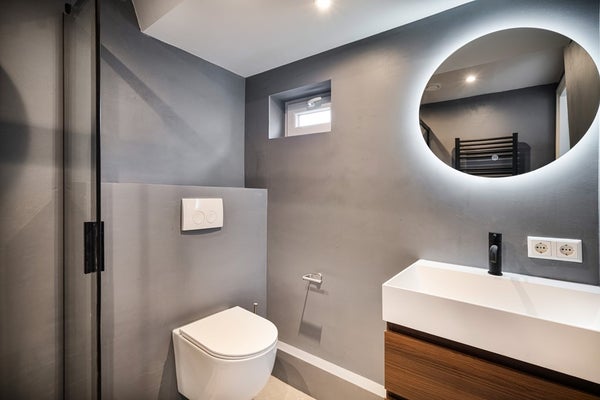 De badkamer is modern en luxe uitgevoerd en beschikt over een betonciré afwerking, een inloopdouche, wastafel en een hangend toilet. De strakke lijnen en hoogwaardige materialen zorgen voor een hotelachtige uitstraling.