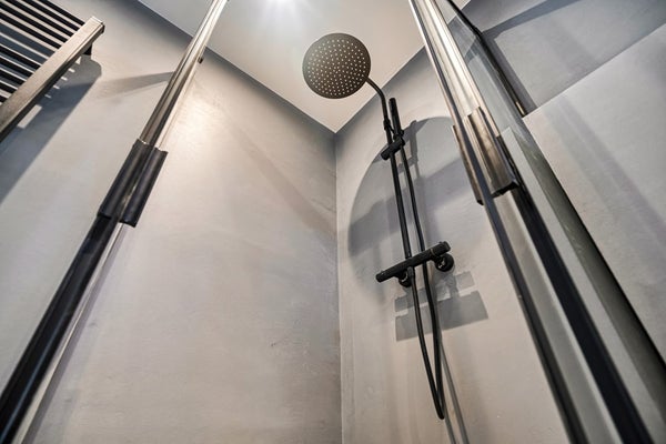 • Badkamer met betonciré, douche, wastafel en hangend toilet