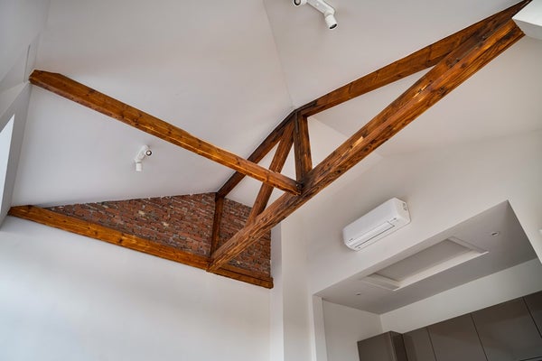 Upon entering, the high-quality finishes are immediately noticeable. The bright living room features a luxurious open-plan kitchen, modernly styled and equipped with high-quality built-in appliances. The combination of the sleek finish, luxurious PVC flooring, and beautiful original beams gives the space a warm and characterful feel.