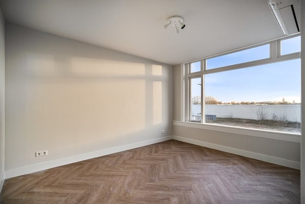 De slaapkamer bevindt zich aan de achterzijde van het appartement en biedt een prachtig, vrij uitzicht over het vaarwater. Een rustige en sfeervolle plek om wakker te worden, met voldoende ruimte voor een comfortabel bed en kastruimte.