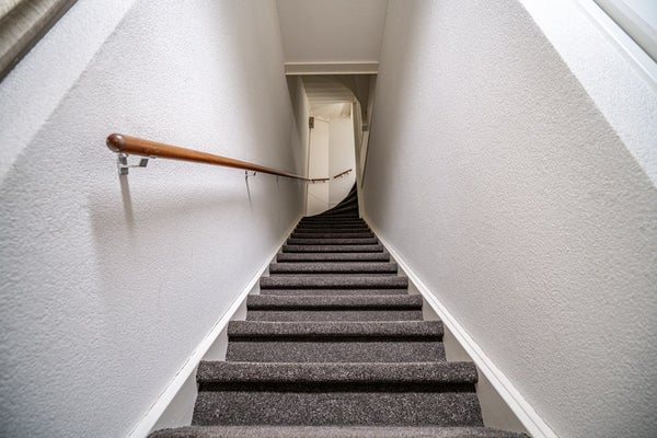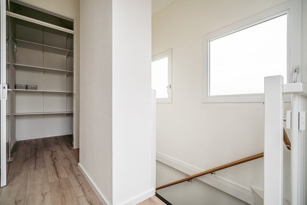The staircase leads to the sleeping floor. Here you will find two spacious bedrooms, a modern bathroom, and a separate utility room.