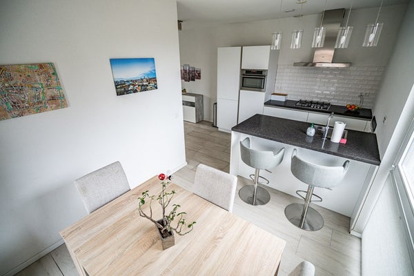 The modern kitchen is fully equipped and practically laid out. The entire floor has comfortable underfloor heating.