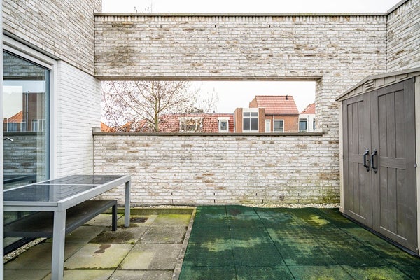 Aan de achterzijde bevindt zich het zitgedeelte met toegang tot de zonnige tuin. Direct daarachter ligt de eigen parkeerplaats op een afgesloten parkeerdek, uitsluitend toegankelijk voor bewoners. Ook is er achter de woning een prettige speelomgeving voor kinderen.