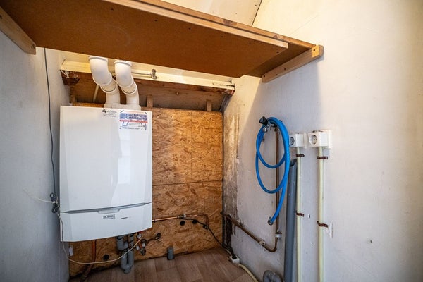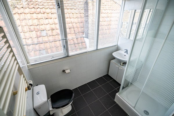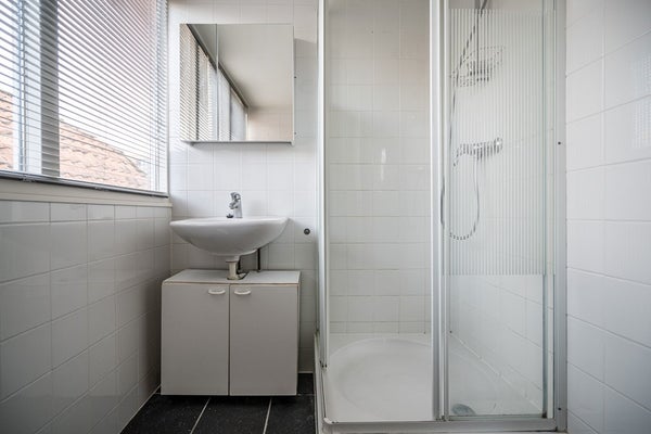 De badkamer is volledig betegeld en praktisch ingedeeld met een douche, wastafel en toilet. De aansluiting voor de wasmachine en droger zijn in de kast aan de voorkant van de woning waar tevens de opstelplaats van de CV ketel is gesitueerd.