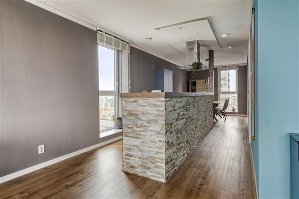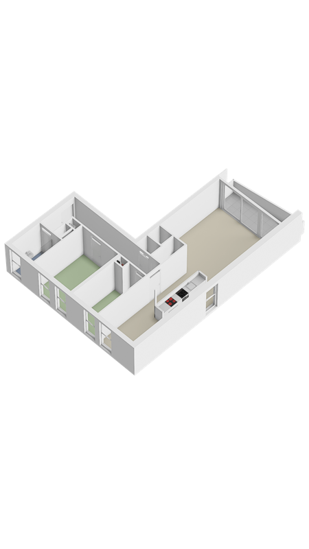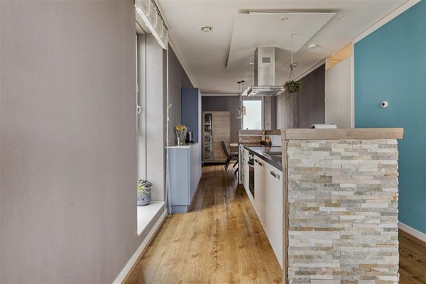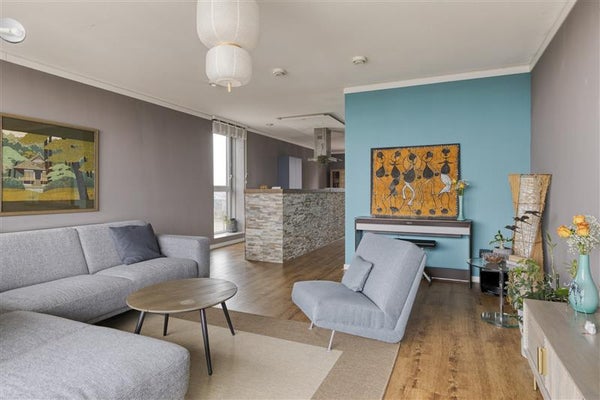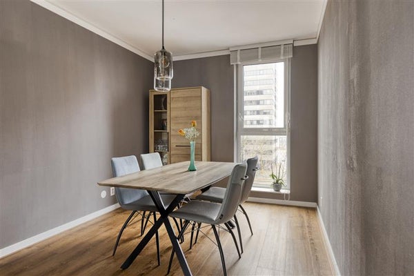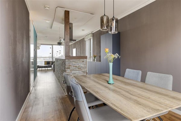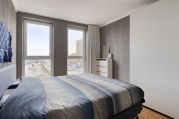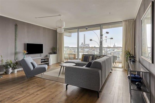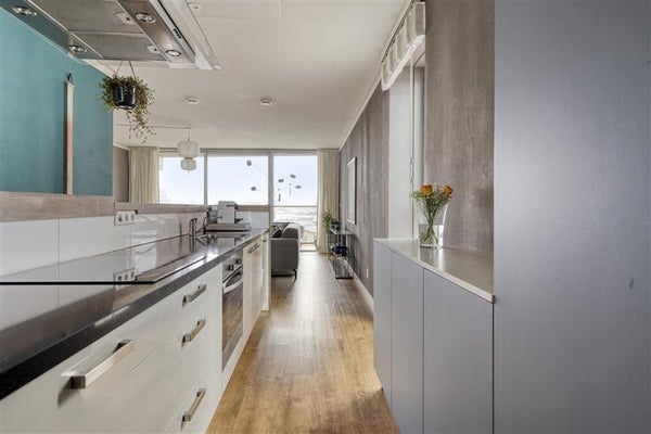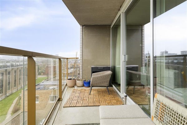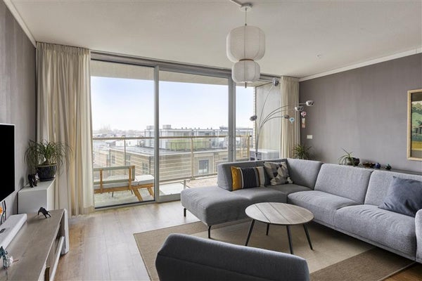 De woonkamer is gelegen aan de achterzijde van het appartement. Via de schuifpui is het balkon bereikbaar. Het balkon is gelegen over de hele breedte van het appartement en is gelegen op het zuidwesten zodat u heerlijk van de zon kunt genieten en niet te vergeten het uitzicht over de stad. Door de grote schuifpui komt er ook veel licht de woonkamer binnen. Daarnaast beschikt het appartement ook nog eens over een zijraam voor nog meer licht.