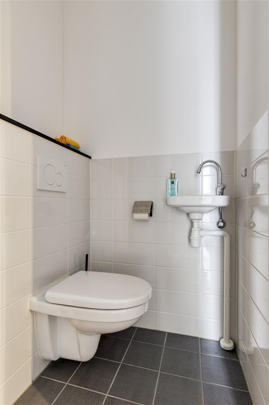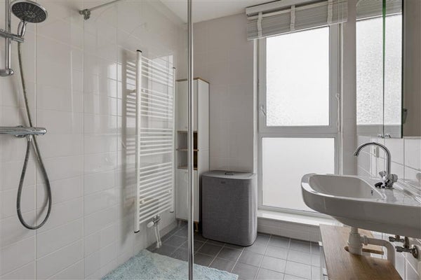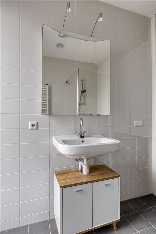 De badkamer is voorzien van een inloopdouche met wastafel en handdoekradiator. Het aparte toilet bevindt zich in de gang en is voorzien van een fonteintje. Ook in de gang bevinden zich een inpandige berging met wtw systeem, de meterkast en een aparte kast met daarin de wasmachine aansluiting.