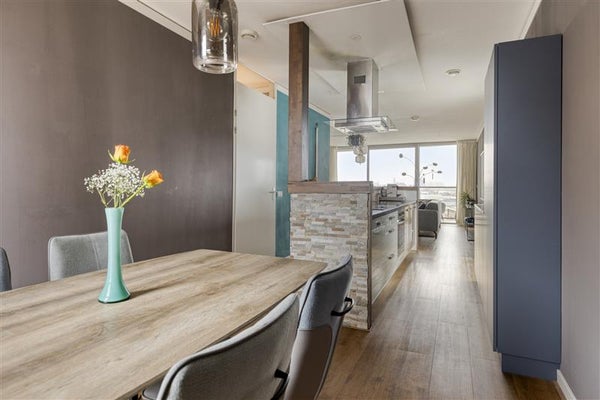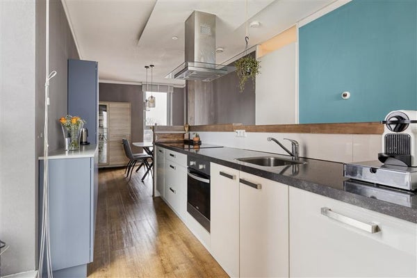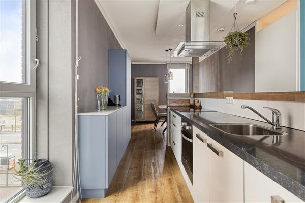 De moderne open keuken is gelegen in het midden van het appartement. De keuken is voorzien van diverse inbouwapparatuur waaronder een vaatwasser, oven, inductiekookplaat en afzuigkap.