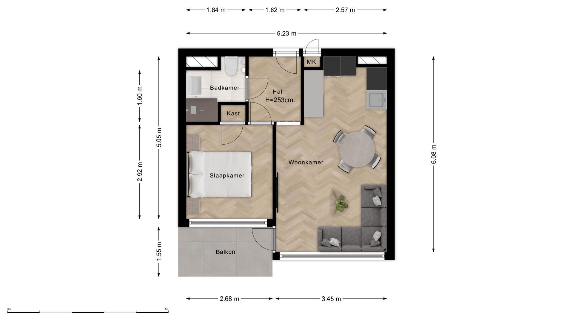 - De galerijflat heeft een woonoppervlakte van 35 m² en beschikt over 2 kamers, waarvan 1 slaapkamer;