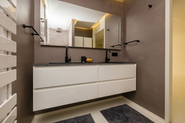 Fraaie, moderne badkamer met inloopdouche, dubbele wastafel met meubel en design radiator.