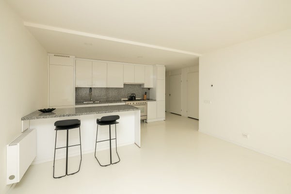 Zeer ruime, lichte woonkamer met open keuken, met glad gestucte wanden en plafond en deur naar het balkon. De open keuken heeft een moderne, luxe inrichting met natuurstenen werkbladen, ruime ontbijtbar en is voorzien van diverse (inbouw) apparatuur zoals een fornuis met oven, afzuigkap, vaatwasser en een koel/vriescombinatie.