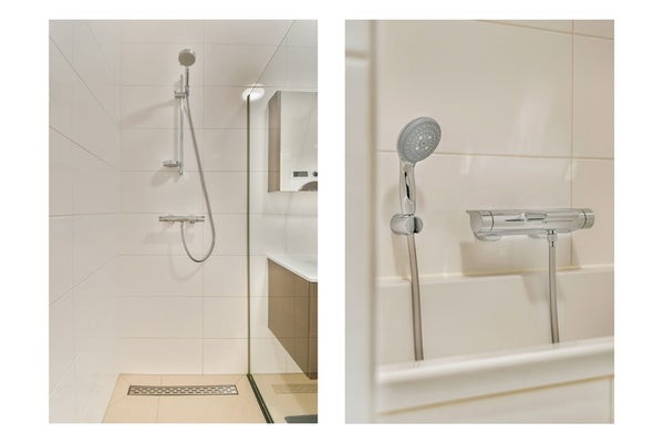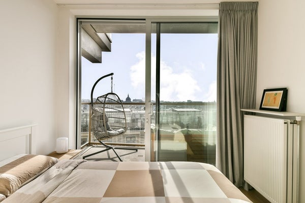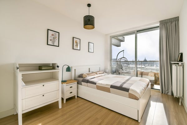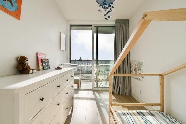 De woning beschikt over twee ruime slaapkamers, beide met een schuifpui en directe toegang tot het balkon. De moderne badkamer is uitgerust met een ligbad, inloopdouche, wastafelmeubel, handdoekradiator en wasmachine- en drogeraansluiting.