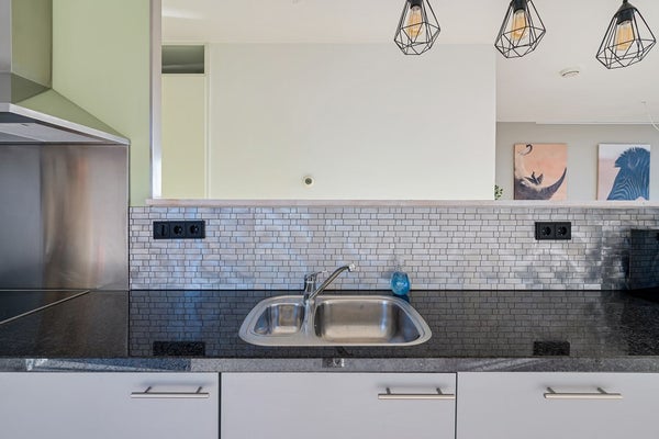 Aan het einde van de hal bevindt zich de deur naar het zit-en eetgedeelte. Het zit-en eetgedeelte wordt gescheiden door de ruime keuken, voorzien van een granieten aanrechtblad, vaatwasser, oven, spoelbak, elektrische kookplaat en voldoende opbergruimte. Vanwege het oppervlak van de zit-en eetkamer, zou je er zelfs nog voor kunnen kiezen om hier een derde slaapkamer te creëren. Over de gehele breedte van het ruime en lichte zitgedeelte bevindt zich het zonnige balkon, te betreden via een schuifpui, die voorzien is van zonwering. Het balkon is gelegen op het zuidwesten en biedt een prachtig uitzicht over het historisch centrum van Leiden en de vele herkenbare gebouwen. Elke dag weer is de zonsondergang een adembenemend schouwspel om keer op keer van te genieten!
