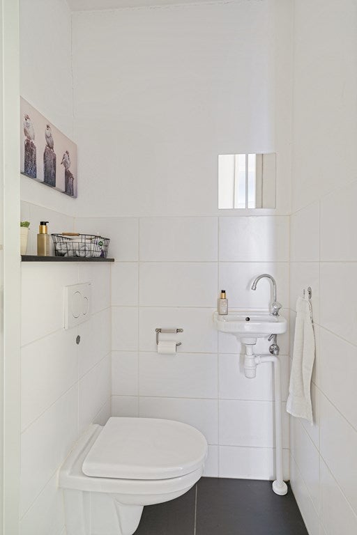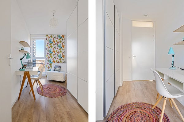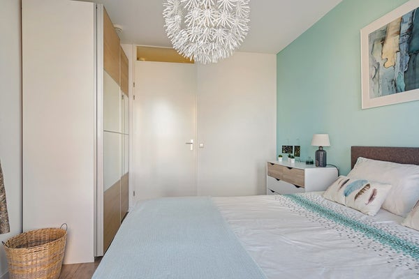 Je betreedt het appartement via een ruime hal, die toegang biedt tot alle vertrekken. Direct rechts vind je de badkamer voorzien van een inloopdouche, wastafel en wastafelmeubel en handdoekradiator. Naast de badkamer bevindt zich een aparte ruimte, voorzien van de wasmachine- en droger aansluiting. Als je verder loopt vind je aan je rechterhand de kast met de stadsverwarming unit voor verwarming en warm water, twee (slaap)kamers en een aparte kast met de elektrameter. Tegenover de slaapkamers bevindt zich het loshangende toilet met fonteintje en een aparte bergruimte met de MV-installatie. Het gehele appartemens is voorzien van een fraaie laminaatvloer.