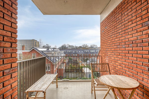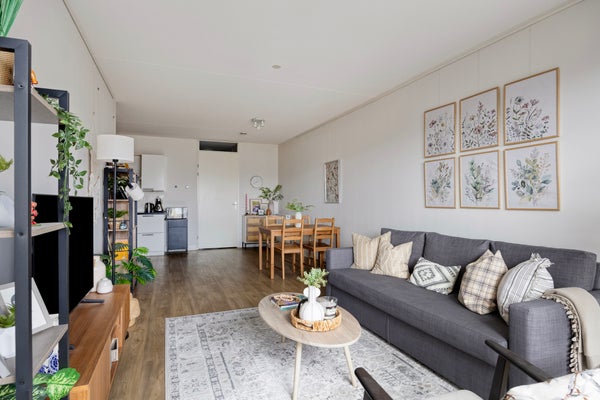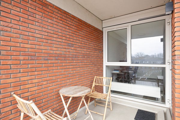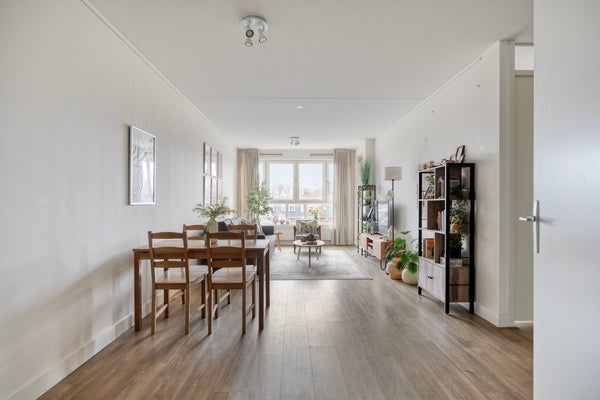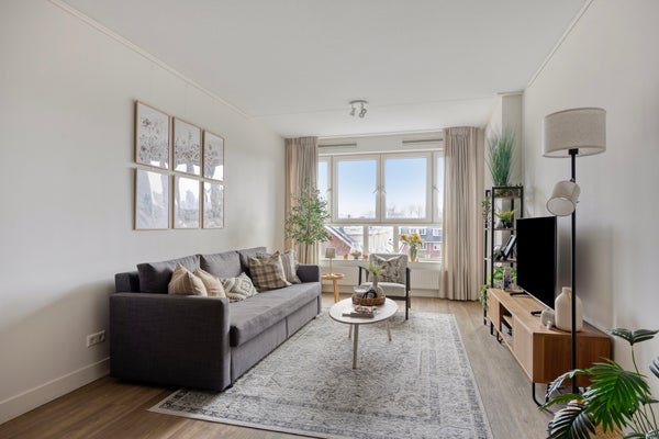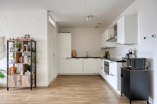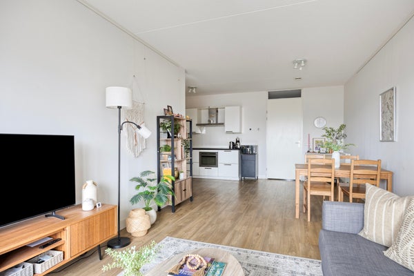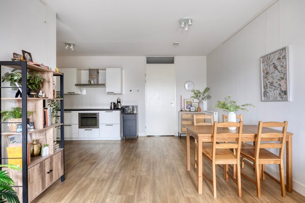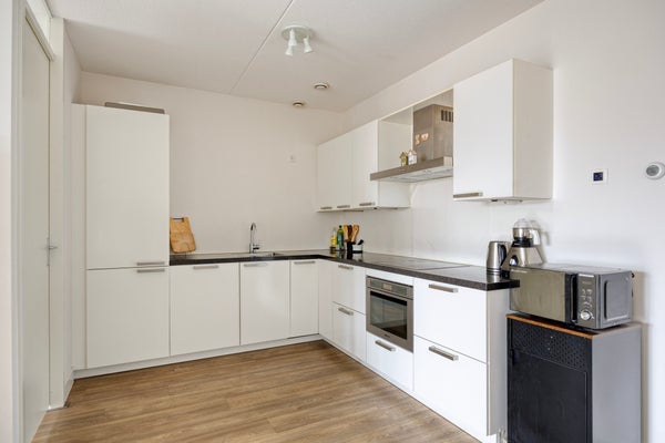 De lichte woonkamer heeft een moderne open keuken met L-vormige opstelling en diverse inbouwapparatuur waaronder vaatwasser en combimagnetron. Via de woonkamer stapt u het zonnige balkon op, gelegen op het oosten. Perfect om in de ochtend te genieten van een kop koffie. Het appartement is volledig gestoffeerd en strak afgewerkt.