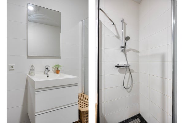 Binnenkomst in een ruime hal die toegang geeft tot alle vertrekken. Aan je linkerhand tref je een moderne, separate toilet en praktische bergruimte met cv-ketel en een wasmachineopstelling. De badkamer is strak afgewerkt met douche, wastafel en een badkamerkast. De ruime slaapkamer biedt ruimte voor een king size bed en inbouwkasten.