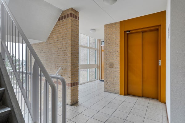 Via de voordeur naar het portiek. Mensen met een rolstoel kunnen heel makkelijk naar de lift. Ook daar is rekening mee gehouden. Wel zo prettig.
