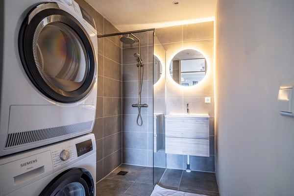 Aan de voorzijde bevindt zich de slaapkamer met directe toegang tot de volledig vernieuwde badkamer, voorzien van vloerverwarming, inloopdouche, wastafel en aansluitingen voor wasmachine en droger.
