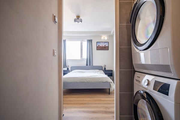 Modern wall-hung toilet with hand basin. At the front of the apartment is the bedroom with direct access to the fully renovated bathroom, featuring underfloor heating, a walk-in shower, a sink, and connections for a washing machine and dryer.