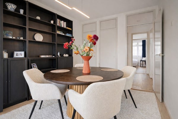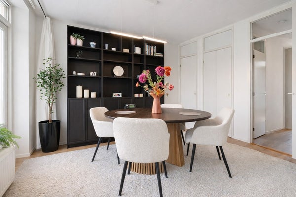 Eén van de kamers is samengevoegd met de woonkamer, waardoor een aparte woon- en eetkamer is ontstaan.