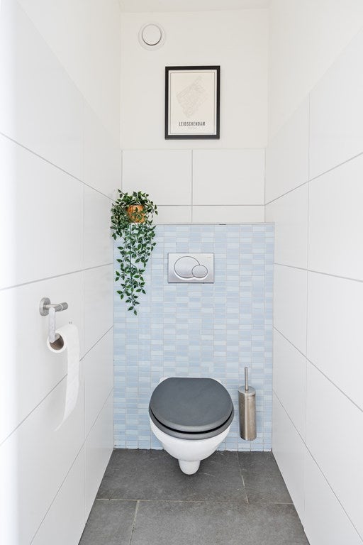 Naast de keuken bevindt zich een modern toilet met vrij hangend closet en hiernaast een eveneens moderne badkamer voorzien van wastafelmeubel en inloopdouche. Tevens bevindt zich in de badkamer de opstelplaats voor de wasmachine en de droger.