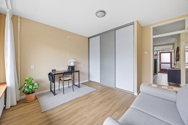 Aan de galerijzijde gelegen, zeer ruime slaapkamer met ruime vaste kast, alwaar zicht tevens de meterkast bevindt (8 groepen met 2 aardlekschakelaars). Aan de rustige achterzijde is de tweede slaapkamer gesitueerd. Deze is eveneens ruim van opzet en is voorzien van een grote garderobekast. In deze kast is ook de opstelplaats voor de (huur-)boiler. Vanuit de achter slaapkamer is het op het zuidwesten gelegen, zonnige balkon te bereiken, dat uitkijkt over een parkje.