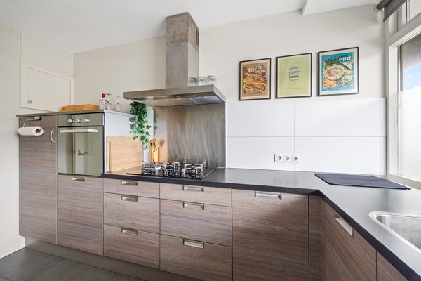 Gemeenschappelijke entreehal met brievenbussen en bellentableau op de begane grond, trap of lift naar de derde verdieping, galerij, entree appartement. Entreehal en lekker brede centrale gang, waarop alle ruimtes uitkomen. Aan de galerijzijde gelegen keuken met modern keukenblok in l-opstelling en voorzien van diverse inbouwapparatuur waaronder een gaskookplaat, afzuigschouw, koelkast, vriezer en afwasmachine.