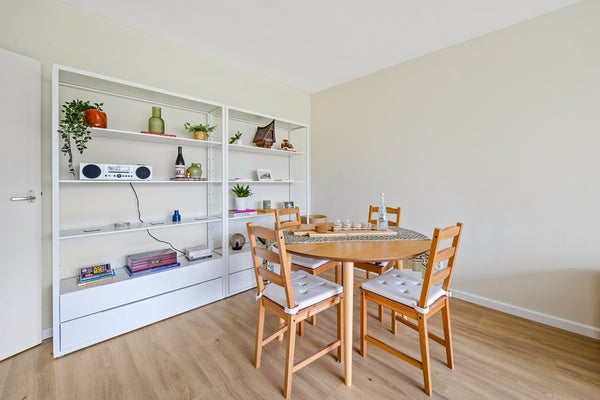 Tevens aan de achterzijde van de woning is de lichte woon-/eetkamer gelegen (ca. 6,85 x 3,65 m), die, net als de centrale hal, is voorzien van een fraaie, lichte laminaatvloer.