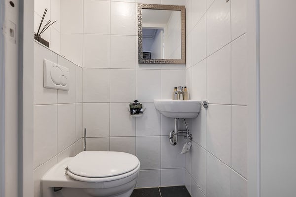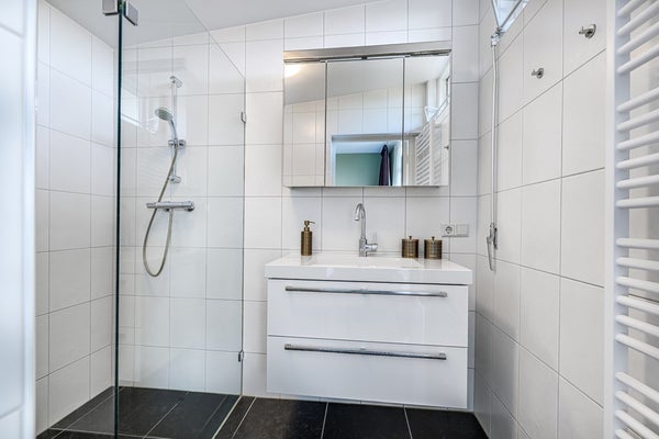 De badkamer is modern afgewerkt en voorzien van een inloopdouche en wastafelmeubel. Het toilet is separaat, wat extra comfort biedt. In de onderbouw bevinden zich twee externe bergingen met een totale oppervlakte van ca. 15,4 m². Verwarming en warm water worden verzorgd door een Nefit cv-ketel.