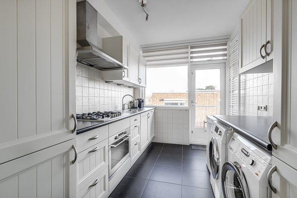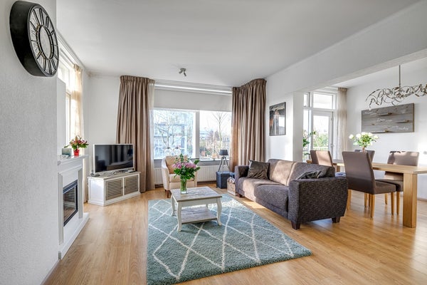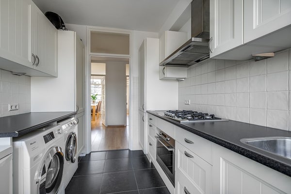 De woonkamer is ruim en prettig ingedeeld, met voldoende plek voor zowel een comfortabele zithoek als een royale eettafel. Vanuit de woonkamer is er direct toegang tot een balkon met uitzicht op het groen. De aangrenzende keuken is netjes uitgevoerd en voorzien van inbouwapparatuur, waaronder een gaskookplaat, oven en afzuigkap. Ook vanuit de keuken is een balkon bereikbaar.