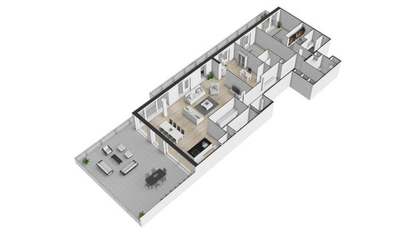 - De galerijflat heeft een woonoppervlakte van 200 m² en beschikt over 4 kamers, waarvan 2 slaapkamers;