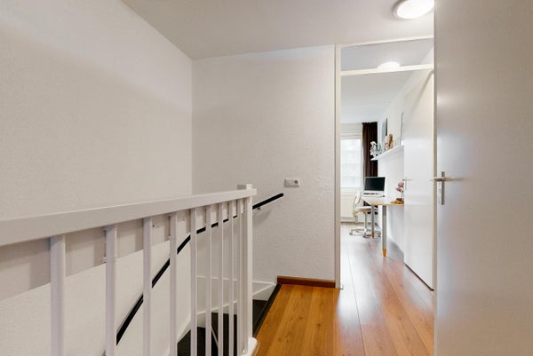 grote overloop, technische ruimte met opstelplaats van de CV combiketel, en aansluiting voor de wasmachine en droger, een moderne badkamer met een inloopdouche, een wastafelmeubel met kastruimte en twee kranen en een zwevend 2e toilet. De ouderslaapkamer aan de voorzijde is voorzien van zelfs twee kastenwanden.