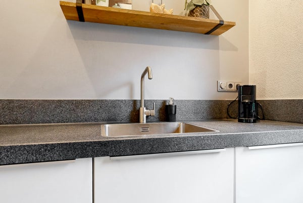 entree, toilet met fonteinmeubel met kastruimte, meterkast en trapopgang. Een moderne deur naar de royale woonkamer met een ruime trapkast met eveneens een moderne deur en met toegang naar de tuin. De open keuken is aan twee zijden en heeft een natuurstenen blad en is voorzien van alle apparatuur.